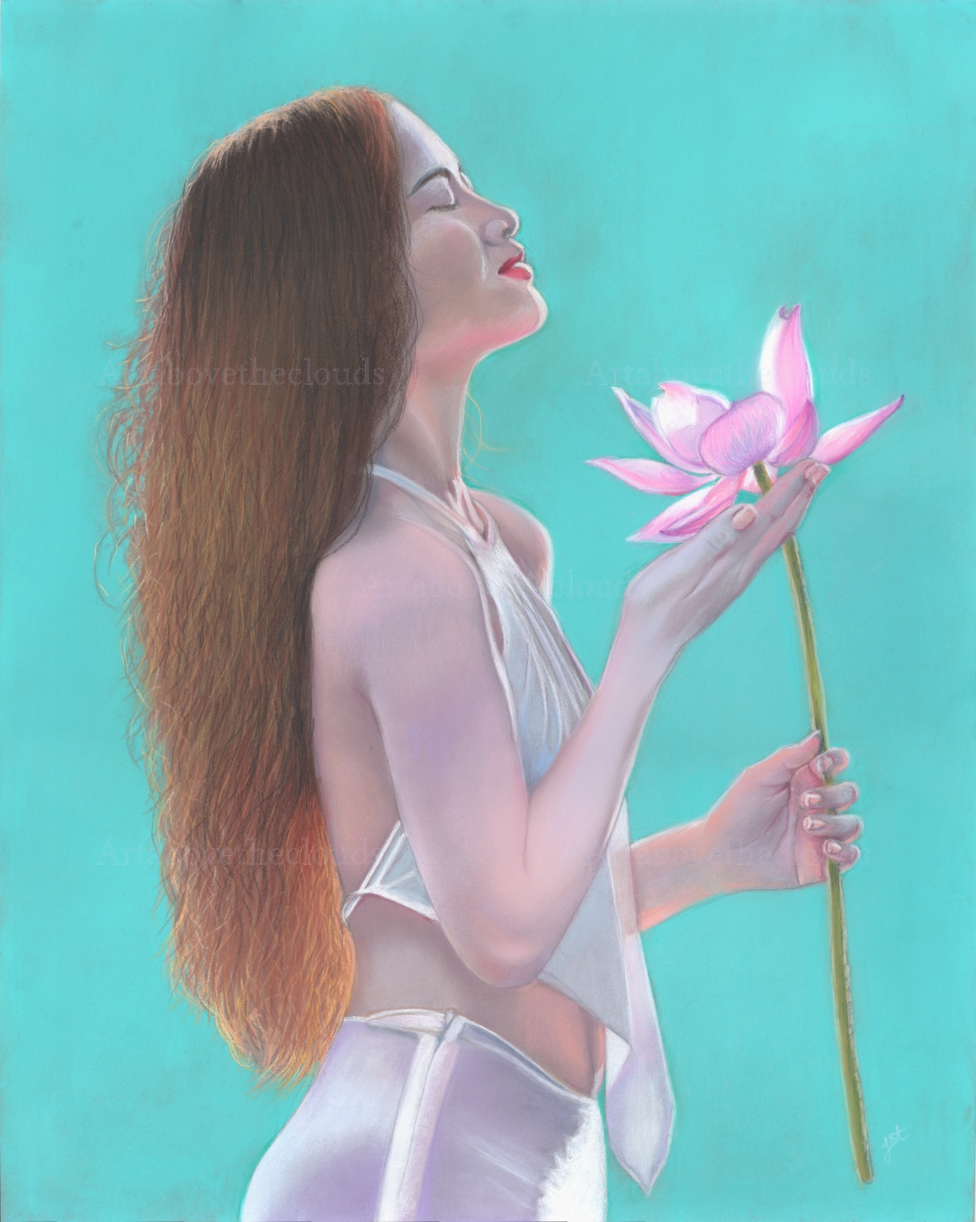 An original pastel on pastelmat. Image size is 50cm x 40cm. Portrait of a beautiful woman holding a lotus flower. Framed in a neutral colour frame ready to hang.