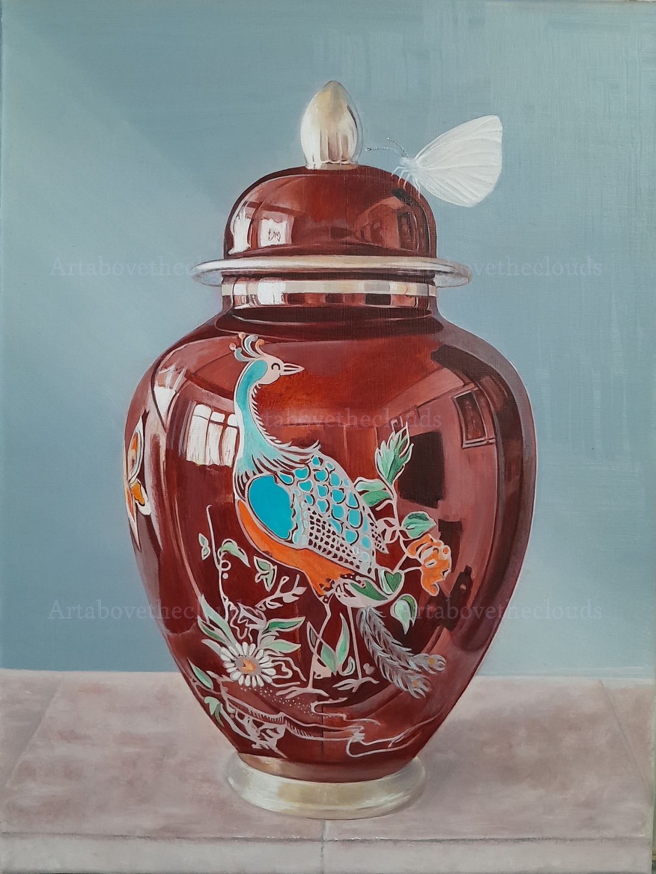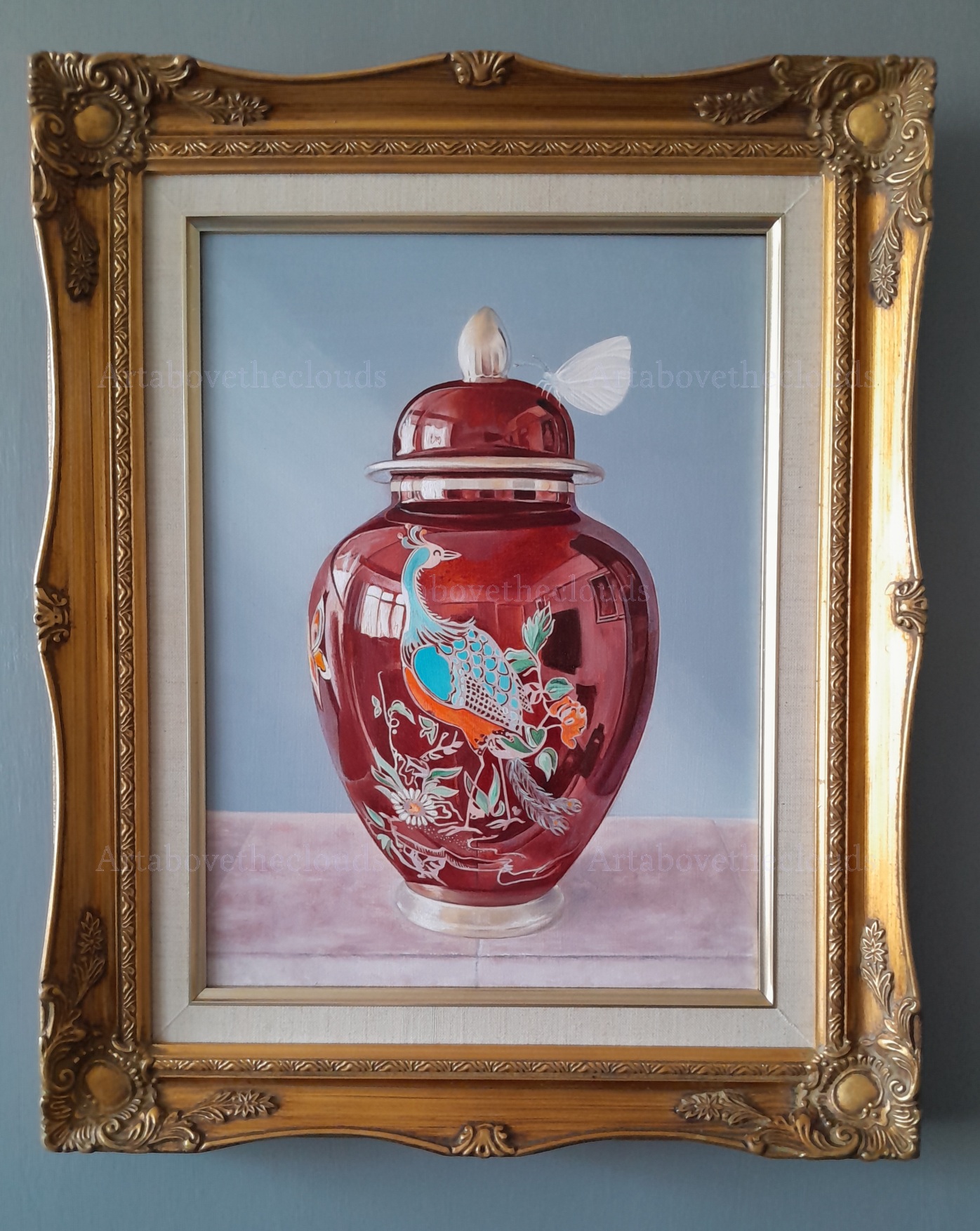 An original oil painting on canvas of a beautiful red lustre spice jar with a little white butterfly sitting on the lid. framed in an ornate traditional gold effect frame.