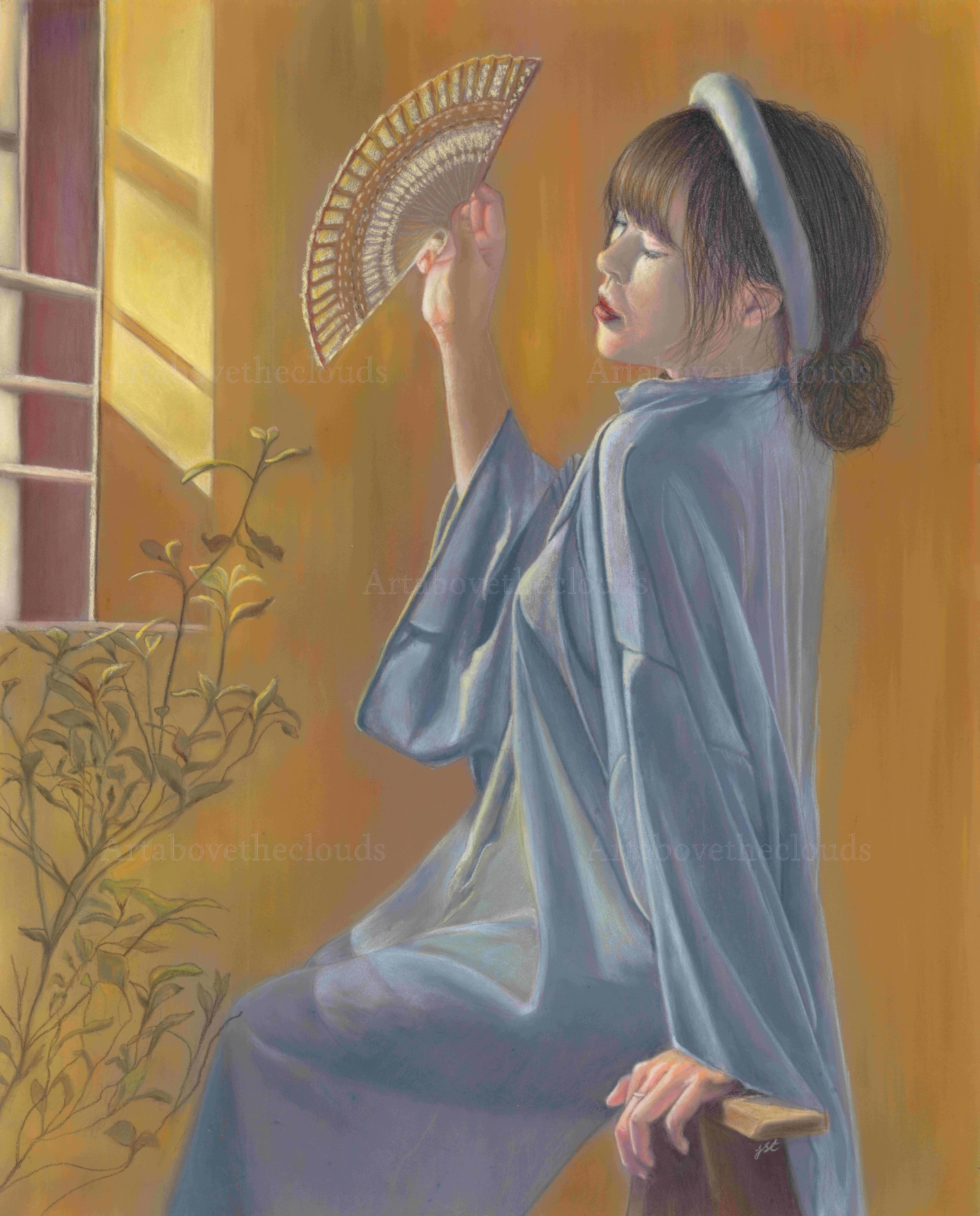An original pastel painting of a young beautiful oriental woman with a fan sitting in front of a window with light streaming through. Image size 50cm x 40cm. framed in a light complementary frame.