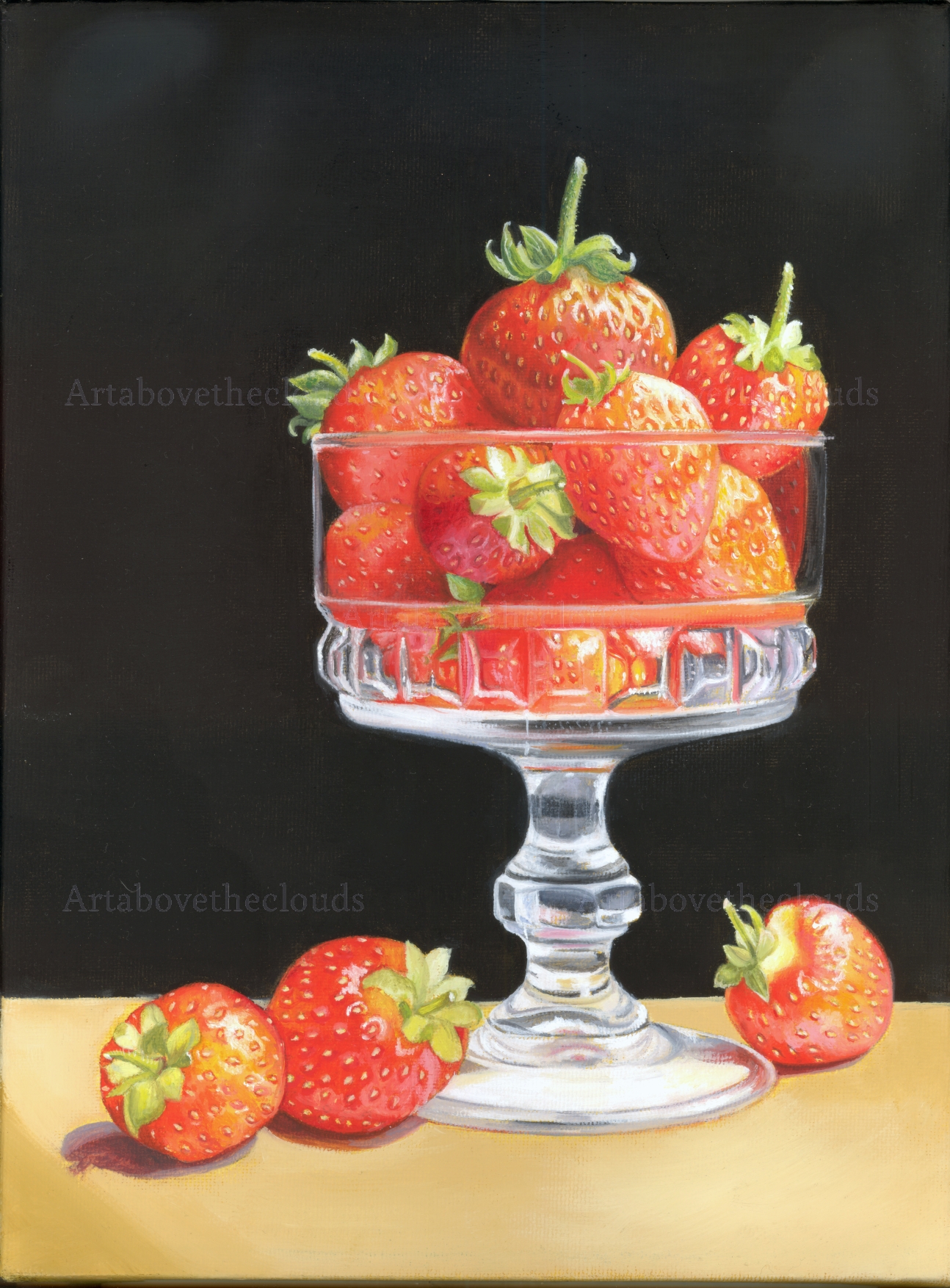 Two's Company. Oil on canvas. A sweet still life painting depicting a glass dessert bowl full of ripe red strawberries. Framed in a black bespoke floating frame ready to hang.
